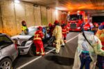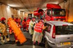 Rond tien voor acht begon het scenario. Een vrachtwagenchauffeur raakte onwel in de tunnel en kwam op de verkeerde weghelft terecht. Daar botste hij frontaal op een camper, waarna vier auto’s er bovenop reden. In totaal waren er zestien gewonden, onder wie enkele ernstig. Om het incident zo echt mogelijk te maken, werden zestien figuranten ingezet en een reanimatiepop gebruikt.