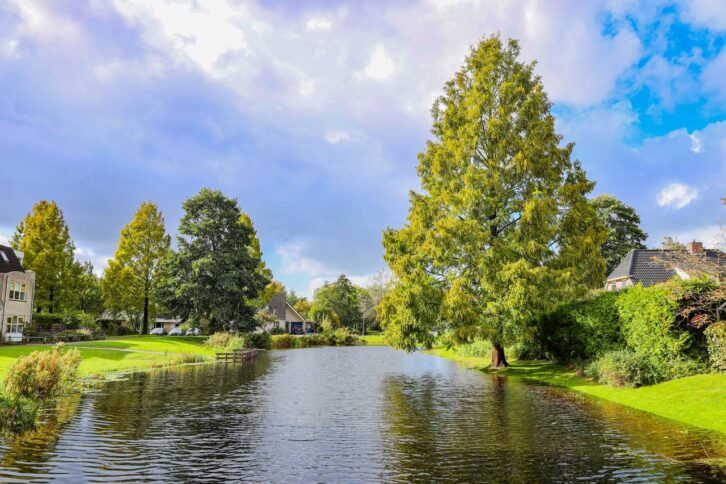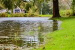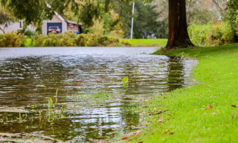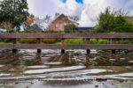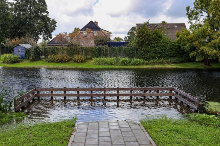 Tolbert – Na de stevige regenval van zaterdagmiddag is een vijver achter basisschool De Beelen buiten de oevers getreden. Het water staat hoger dan normaal en stroomt over de aangrenzende steiger.