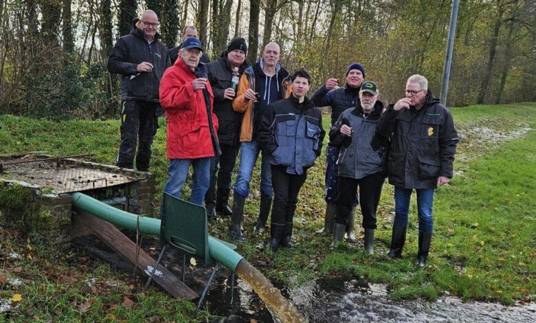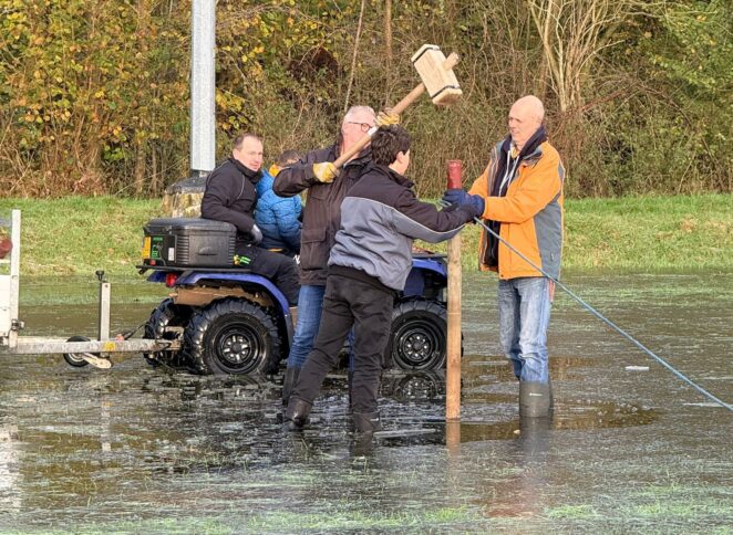 De palen zijn stevig in de grond geslagen en de pomp is aangezet. Alle voorbereidingen zijn getroffen om bij de eerste echte vorstperiode van start te kunnen gaan. Na afloop van de werkzaamheden brachten de vrijwilligers een toast uit met de wens dat er deze winter veel schaatsplezier beleefd mag worden op de ijsbaan.