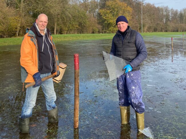 Leek – Afgelopen zaterdag hebben de vrijwilligers van IJsvereniging Leek hun laarzen aangetrokken en de ijsbaan in Nienoord uitgezet. Door de overvloedige regenval van de afgelopen dagen was het dit keer een bijzonder nat klusje, maar de gedreven vrijwilligers lieten zich niet tegenhouden.