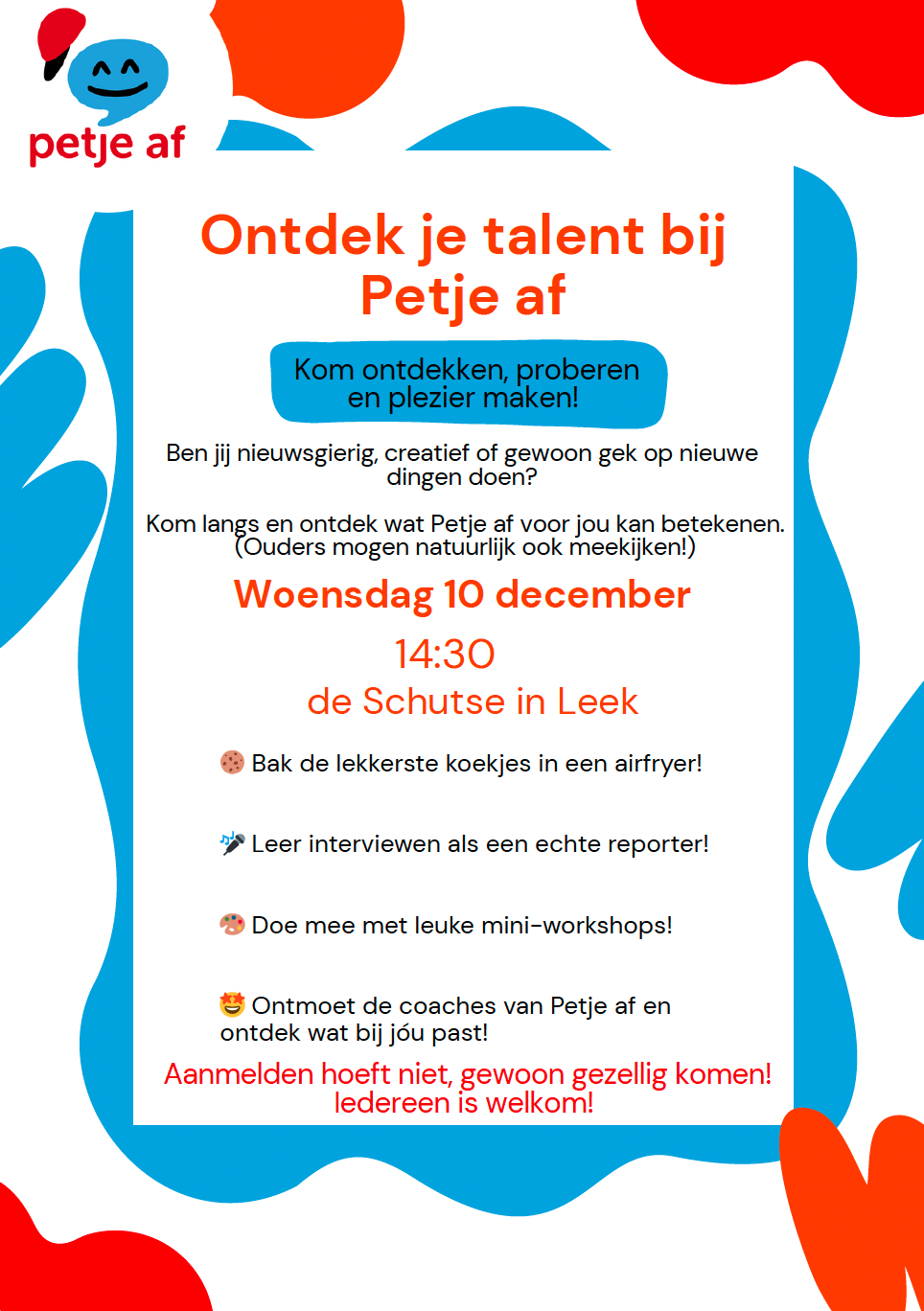 Tijdens de open middag kunnen kinderen meedoen aan korte, leuke activiteiten zoals koekjes bakken in een airfryer, leren interviewen als een echte reporter en deelnemen aan creatieve mini-workshops. Ook kunnen zij kennismaken met de coaches van Petje af en ervaren hoe leuk leren buiten de schoolmuren kan zijn. Ouders zijn van harte welkom om mee te komen.