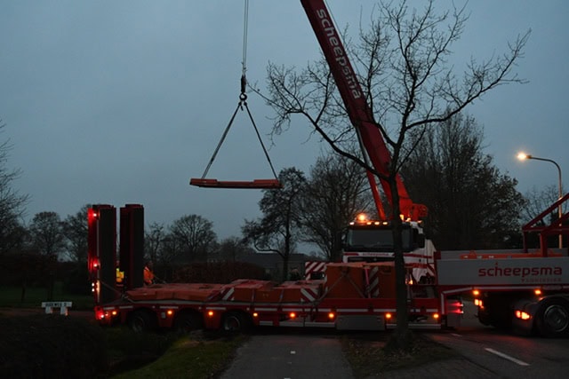 Nuis – Een dieplader, geladen met zware contragewichten, heeft vanmorgen enkele uren de Nieuweweg in Nuis geblokkeerd.