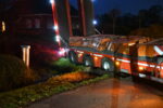 De vrachtwagen was onderweg naar een bouwlocatie, toen de vrachtwagen bij het achteruitrijden vast kwam te zitten in de berm. De dieplader was geladen met ongeveer 20 ton aan contragewichten, die er later door een kraan van het bedrijf zijn afgehaald. Of deze kraan de dieplader ook weer vlot heeft getrokken, of dat hiervoor een andere kraan ter plaatse komt, is niet bekend.