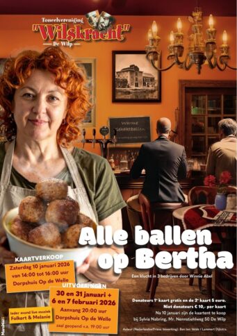 De Wilp – In dorpshuis “Op de Welle” is toneelvereniging Wilskracht bezig met de laatste loodjes voor de komende uitvoeringen. Maar liefst 4 x treden zij hierop met het stuk Alle ballen op Bertha, een blijspel geschreven door Winnie Abel en vertaald en bewerkt door Ben ten Velde.