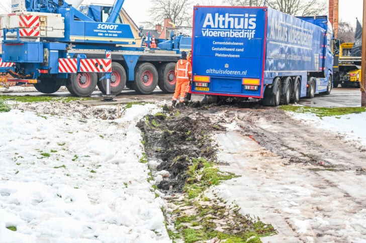 Samen met de grote telekraan van Schot is de vrachtwagen opgetild om vervolgens aan te trekken richting het asfalt. Tijdens het hijsen deukte de trailer in maar na de grote operatie stond de vrachtwagen met zijn trailer weer veilig op het asfalt. De vrachtwagen raakte beschadigd maar kon na wat aanpassingen zelf huiswaarts keren.