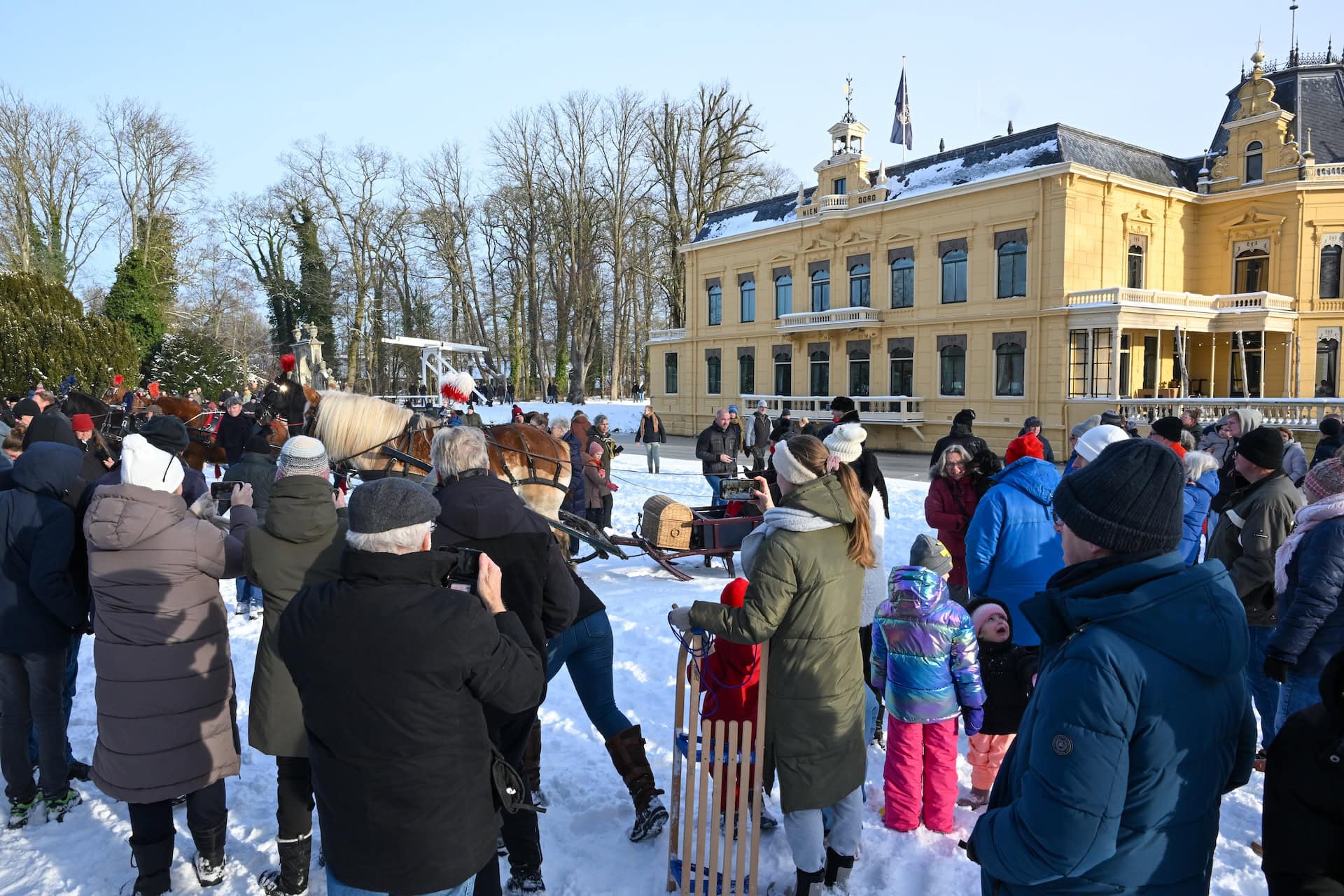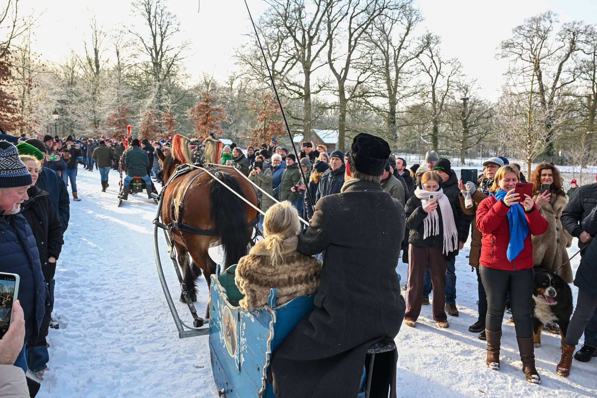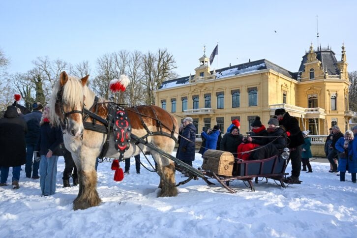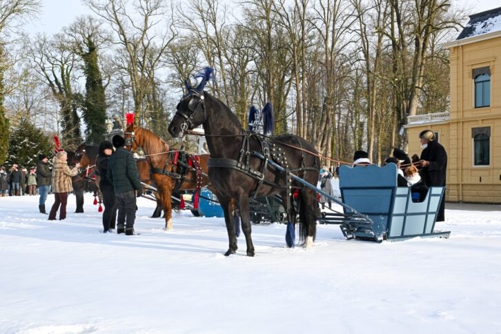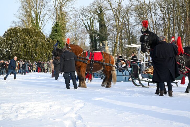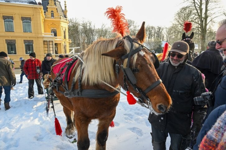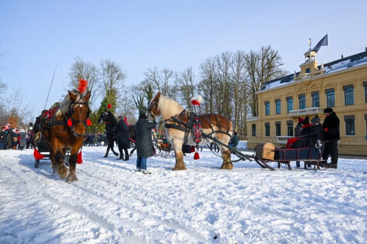 Leek – Vereniging Rijden en Glijden organiseerde zondagochtend 11 januari een tocht met 6 aangespannen sleden op landgoed Nienoord. Bij een stralende winterochtend met een temperatuur van ongeveer -4 graden en voldoende sneeuw van afgelopen dagen vond de bijzondere tocht plaats met bekijks van ruim 1500 bezoekers uit de hele regio en daarbuiten.