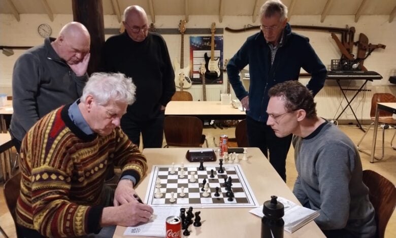 Dat klopte. Precies op dat moment veroverde Gerwin, die overigens al heel goed stond, de dame van zijn tegenstander Frans van Doorn, die even daarna gedesillusioneerd opgaf. Daarmee was de 3-1 eindstand bereikt.