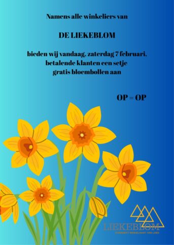 Bij de bloembollen zit een kaartje met de tekst: “De winkeliers van de Liekeblom wensen u een fantastisch voorjaar.” Bij de deelnemende ondernemers hangt een poster die de actie aankondigt.