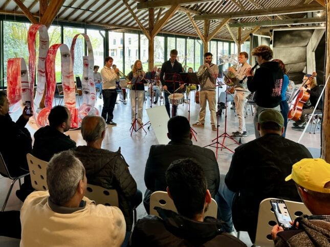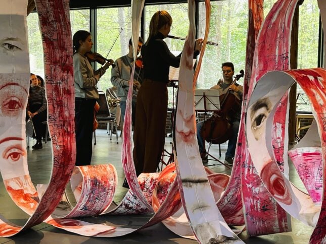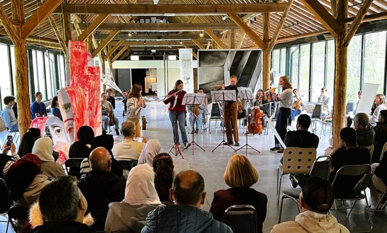 Het orkest en de gasten zaten rondom een sculptuur van kunstenaar Peter Dijk. Zijn rood-witte papieren, spiraalvormige banden zijn aan de ene kant bedrukt met landschappen, stratenpatronen en kaarten, en aan de andere kant voorzien van ogen en monden. Museumdirecteur Geert Pruiksma lichtte toe dat het kunstwerk gaat over onderweg zijn: afhankelijk van welke kant de papieren band op buigt, ontmoet je de een of mis je de ander. Het kunstwerk wiegde zachtjes mee op de muziek en het applaus, als verbinding tussen de orkestleden uit het hele land en de cursisten die van over de hele wereld in het Westerkwartier zijn neergestreken.