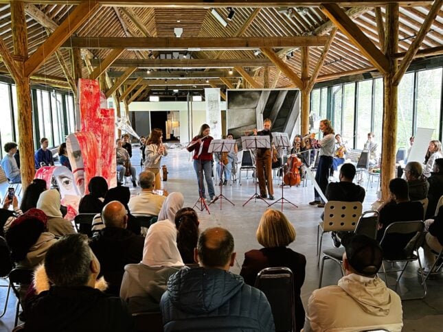 Leek – Het Nederlands Studenten Kamer Orkest NESKO trad op in Museum Nienoord tijdens de tentoonstelling PapierPapier. Het publiek bestond uit cursisten van STAVOOR, de organisatie voor alfabetisering en inburgering in Leek.