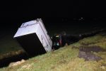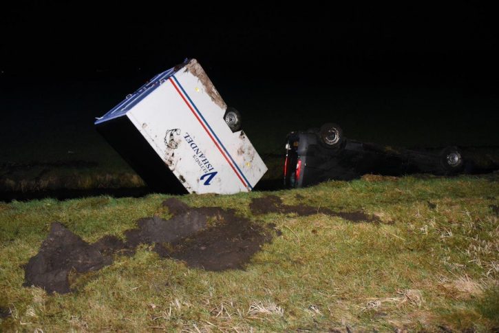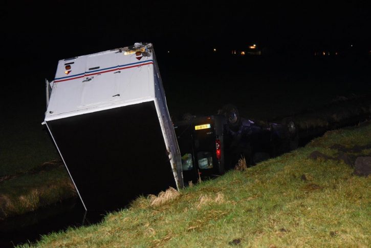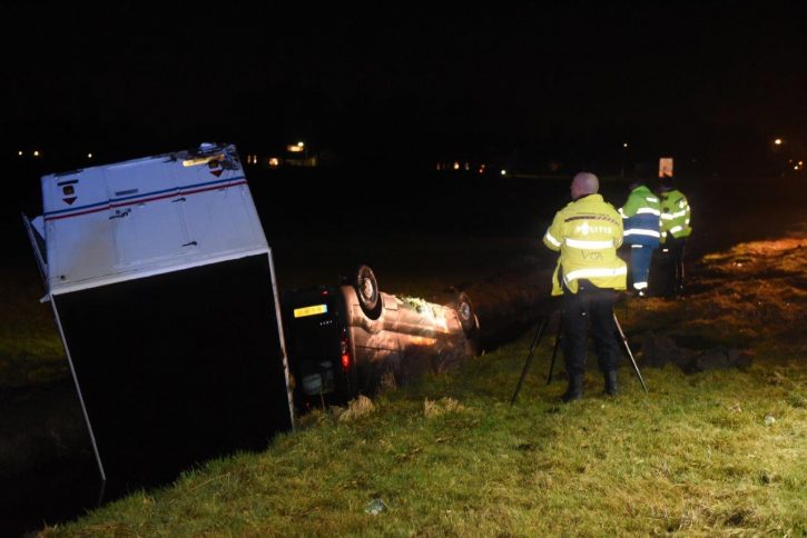 LEEK – Een bestelbus met daarachter een viskraam gekoppeld die zondagavond over de A7 richting Groningen reed is ter hoogte van Leek op de kop in de sloot belandt.