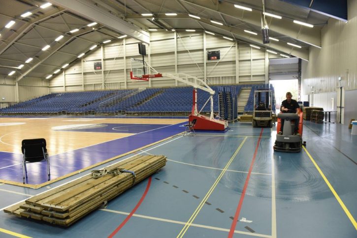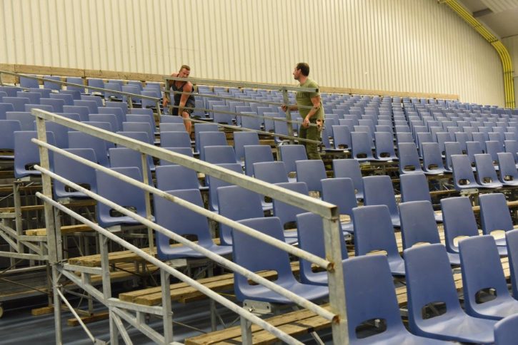 Maandag is begonnen met het neerleggen van de speelvloer, zijn er extra anker punten aangebracht zodat de baskets volgens norm verankerd konden worden en is gestart met het opbouwen van de tribunes met in totaal plek voor 2800 toeschouwers.