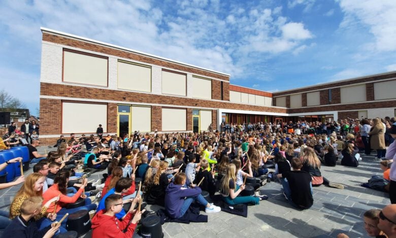 Twee jaar geleden werd al contact gezocht met ‘de Vuilnismannen’ om langs te komen voor de schoolopening. Afgelopen woensdag konden zij eindelijk hun reis naar Leek maken om hun shows uit te voeren met de brede school. Hun slogan ‘allemaal trommelen op rommel’ deden zij eer aan door alle leerlingen en leerkrachten, over de 500 totaal, te voorzien van containers, emmers of metalen shakers, waarmee zij een optreden verzorgden voor ouders, familie en vrienden.