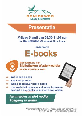 LEEK – Vrijdagochtend 5 april geven Jaap van der Meer en Thea Siegers van Bibliotheken Westerkwartier bij SeniorWeb Leek & Marum een presentatie over e-books.