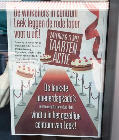 Vandaag krijg je in Leek speciaal vanwege Moederdag bij aankoop bij je favoriete winkel een taart. Er worden door de winkeliers totaal 150 taarten weggegeven. Bij aankoop krijg je in de winkel een bon en deze kun je vervolgens inleveren bij de Hema voor een taart.