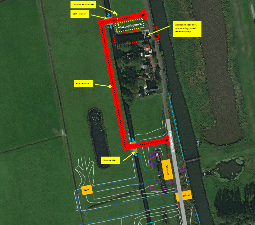 De aannemer, De Boer en De Groot, begint na de bouwvakvakantie (week 35) met het aanbrengen van de tijdelijke omleiding. Begin september zal vervolgens de ontmanteling van het gemaal starten en wordt de omleiding van kracht. Eind september zal de aannemer de Lettelberterdijk weer dicht maken door middel van klinkers. Dit wordt met klinkers gedaan, omdat direct asfalt aanbrengen risico’s zoals verzakkingen met zich meebrengt.