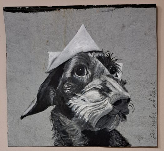 Anneke Ekhart schildert de laatste jaren vaak portretten van mens en dier. Daar heeft ze haar eigen unieke draai aan gegeven. Ze is duurzaam bezig, omdat ze op gebruikte en verweerde plaatjes zink schildert. Dat doet ze met acrylverf in zwart/wit.