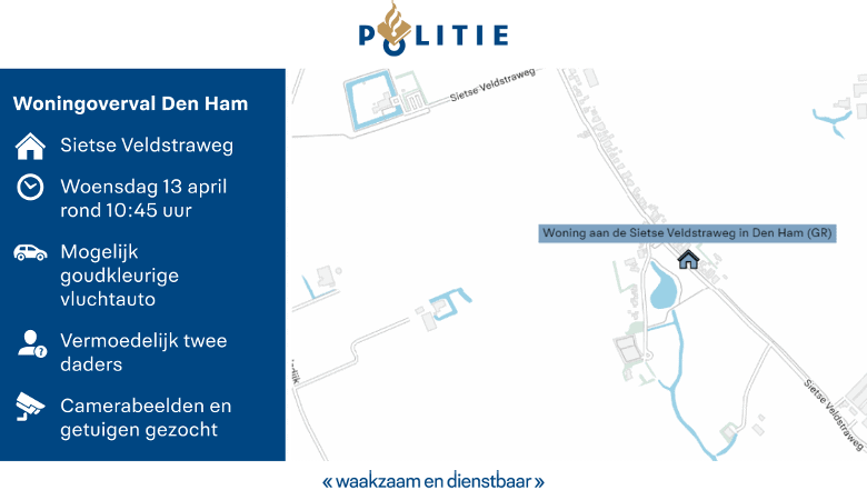 Westerkwartier –  De politie kreeg woensdagochtend de melding van een woningoverval aan de Sietse Veldstraweg in Den Ham. Rond 10:45 uur werd een van de bewoners van een woning aan de Sietse Veldstraweg overvallen door vermoedelijk twee personen.