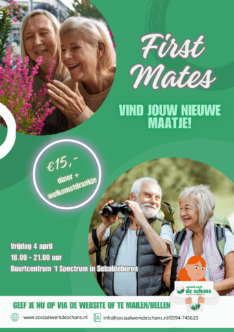 Daarom organiseert Sociaal Werk De Schans op vrijdag 4 april een nieuwe editie van First Mates in ’T Spectrum in Sebaldeburen. Een perfecte manier om het voorjaar te verwelkomen met nieuwe vriendschappen, een gezonde dosis gezelligheid en de kans om nieuwe contacten op te doen!