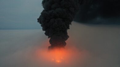Mist en forse rookwolken van grote brand zorgen voor bijzonder beeld